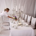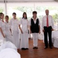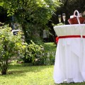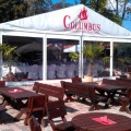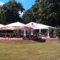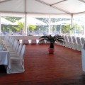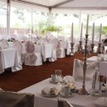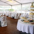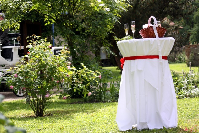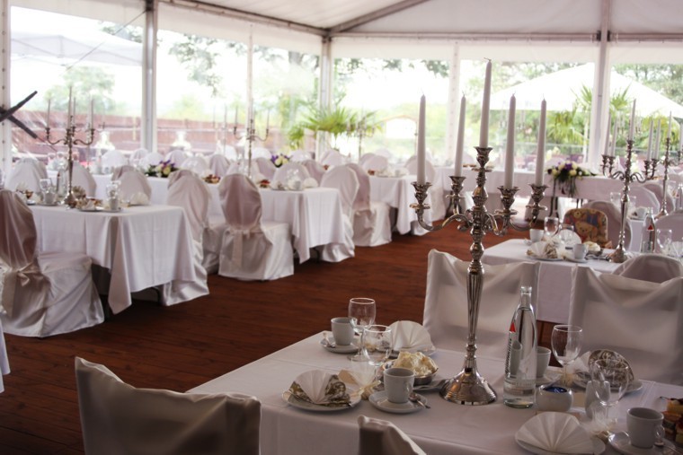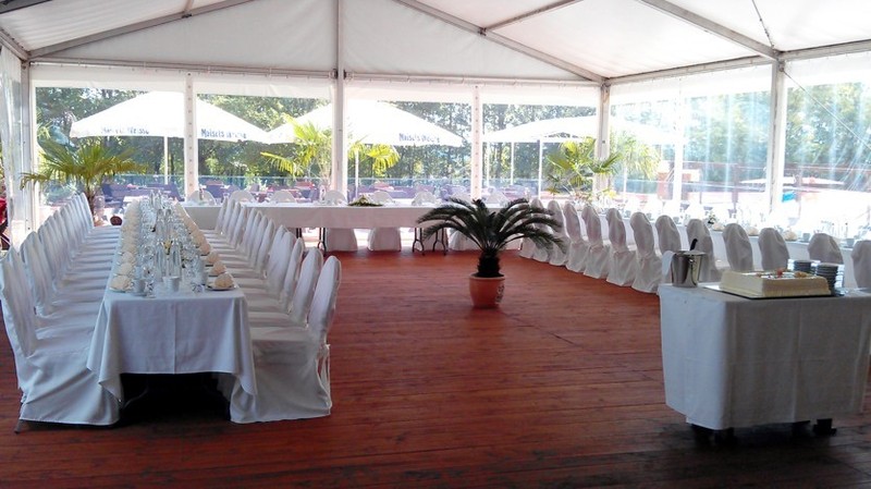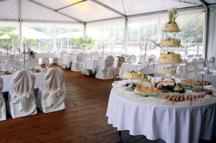 Neu 2013 : Das große Zelt ist zur "Hochzeits-Pagode" aufgerüstet, mit einem weißen gerafften Himmel, dazu einem separaten Cateringbereich und einem zusätzlichen Buffet-Barbecue-Pavillion erweitert ! Dazu wird diese festliche Athmosphäre durch entsprechend abgestimmte Deko-Farbstrahler besonders stimmungsvoll beleuchtet ! Der Sitzbereich wird ganz im festlichen Charakter mit runden Tischen und Bankettstühlen mit weißen Hussen für eine Personenzahl zwischen 60 und 150 Gästen entsprechen bzw.angeordnet werden.